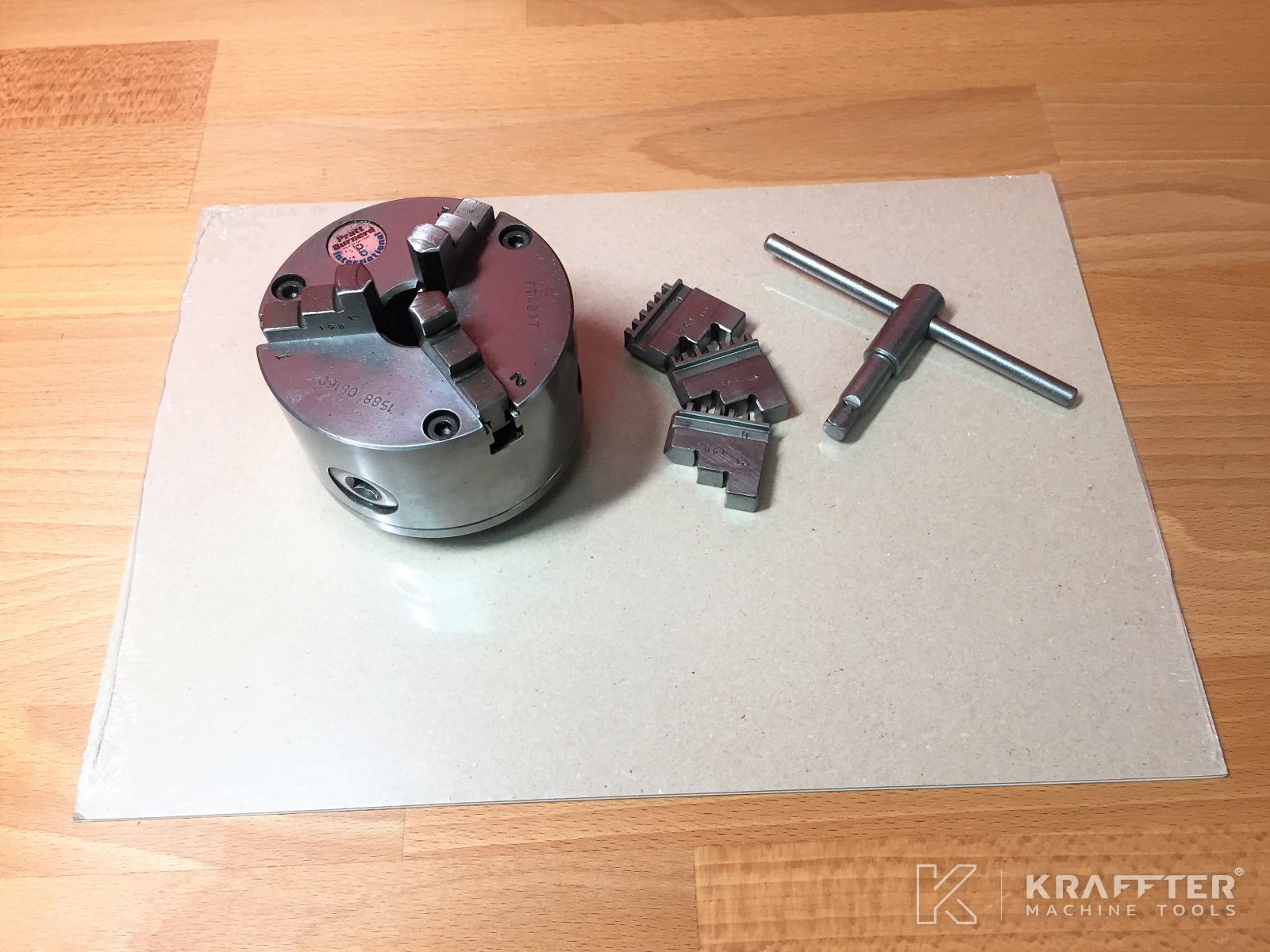 - 1 mandril PRATT BURNERD de Ø80 [mm] con 3 mordazas concéntricas, montado sobre placa de ajuste de la nariz del husillo, con 1 anillo
